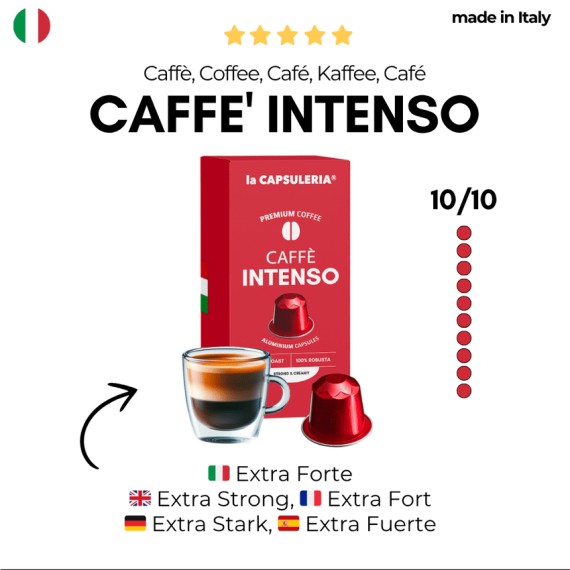 Intensiver und gerösteter Kaffee. Kräftig, cremig und anhaltend. Dunkle Röstung. Intensität 10