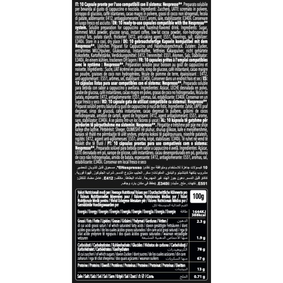 Das Ergebnis dieser außergewöhnlichen Mischung ist ein Cappuccino mit Haselnussaroma, einem süßen Geschmack und einer großzügigen Crema.