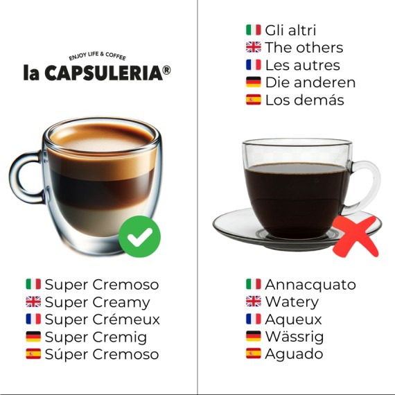 Our capsules for your Nespresso machine are the result of years of study, research, testing and trials. After several years, we can say that we have achieved truly unparalleled quality. Our capsules produced in Italy will be perfect for your coffee machine, whether it is a De Longhi, Krups, Saeco, Philips, etc. Coffee machines no longer have any secrets for us. We know exactly how a capsule must be produced to ensure that the result is extremely creamy, intense and full of flavour.