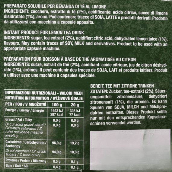 La Bebida Fría con sabor a Té Negro Limón es una opción práctica y refrescante en cápsulas compatibles con máquinas Nescafé Dolce Gusto®*. En taza combina la intensidad del té negro con la frescura cítrica del limón, creando una bebida ligera y agradable. Ideal para disfrutar fría en cualquier momento del día, representa una alternativa práctica a las bebidas azucaradas tradicionales. Su preparación es rápida y sencilla, con resultados constantes. El formato de 64 cápsulas (4x16) garantiza comodidad y disponibilidad para el consumo diario.