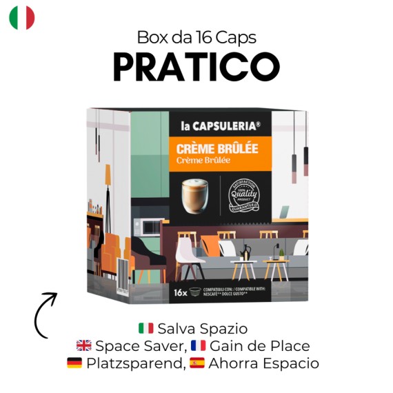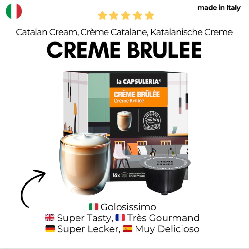 Basándonos en la receta original francesa de 1691, hemos creado una deliciosa bebida con sabor a Creme Brulee (Crema Catalana) con un irresistible sabor a caramelo, nata y vainilla