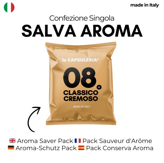 Cápsula envasada individualmente en el pack Aroma Saver. Perfecto para conservar todos los aromas del café recién tostado.