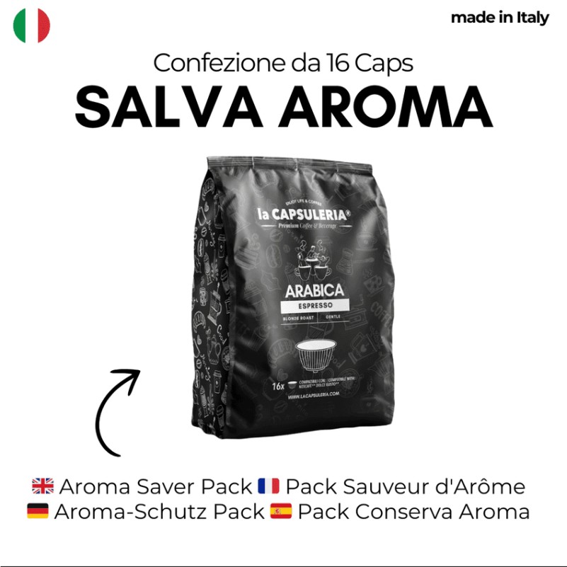Capsule conditionnée dans l'Aroma Saving Pack. Parfait pour conserver tous les arômes du café fraîchement torréfié.