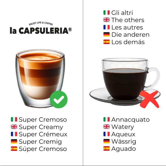 Nos capsules pour votre machine Nespresso sont le résultat d'années d'études, de recherches, de tests et d'essais. Après plusieurs années, nous pouvons dire que nous avons atteint une qualité vraiment inégalée. Nos capsules produites en Italie seront parfaites pour votre machine à café, qu'il s'agisse d'une De Longhi, d'une Krups, d'une Saeco, d'une Philips, etc. Les machines à café n'ont plus de secret pour nous. Nous savons exactement comment une capsule doit être produite pour que le résultat soit extrêmement crémeux, intense et plein de saveur.