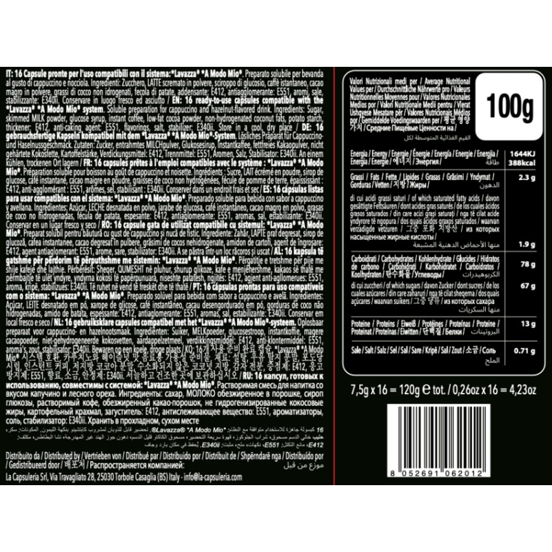 - Capsule di preparato solubile per bevanda al gusto di Cappuccino alla Nocciola pronte per l’uso compatibili con il sistema Lavazza A Modo Mio®*