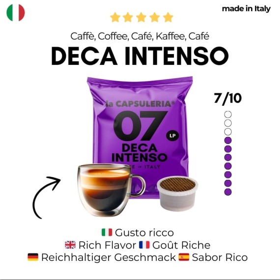 Caffè Decaffeinato dal gusto tostato e persistente. Il processo di decaffeinizzazione avviene tramite lavaggio con acqua ed è totalmente naturale.