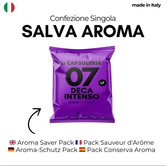 Capsula confezionata singolarmente nella Confezione Salva Aroma. Perfetta per preservare tutti gli aromi del caffè appena tostato.