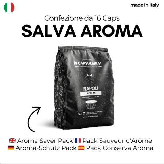 Capsula confezionata nella Confezione Salva Aroma. Perfetta per preservare tutti gli aromi del caffè appena tostato.